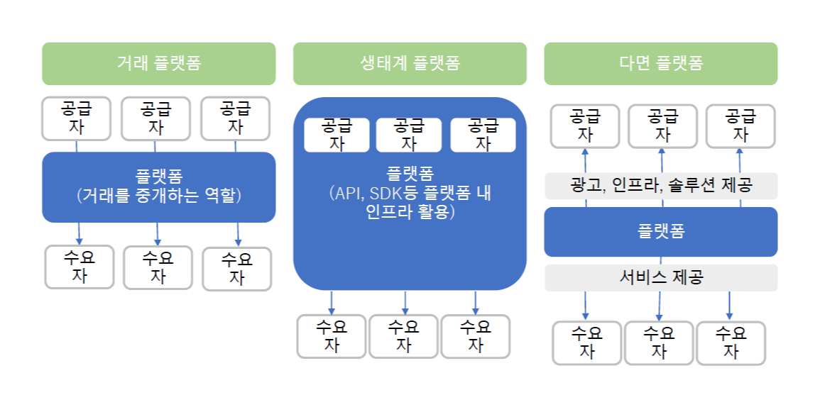 - 사업자가 제공하는 다양한 인프라를 활용해서 제품이나 서비스를 만들어서 수요자에게 제공하는 플랫폼